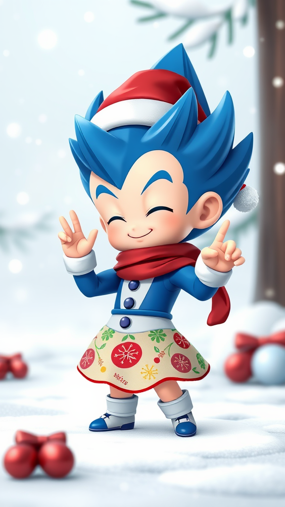 Chibi-style 3D character of Vegeta wearing a festive Christmas dress, complete with whimsical holiday patterns and a tiny Santa hat, striking a playful pose amidst a wintry backdrop with softly falling snowflakes.