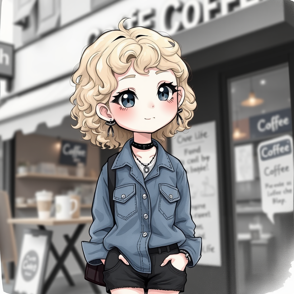 Chibi-style adorable blonde girl wearing a cute outfit stands by a coffee shop, capturing full-body charm. She sports a denim shirt with curly hair and goth-inspired jewelry, like a necklace and earrings. The image has a whimsical, airbrushed touch, with playful crossed eyes adding to her charm. Despite some elements of blur and artistic imperfections, such as slight distortions and abstract details in the background, the scene maintains a delightful, dreamlike quality. The artistic style leans towards a sketch-like or painterly effect, enhancing the overall creativity and uniqueness of the piece, with a subtle monochrome and grayscale palette that adds depth and intrigue.