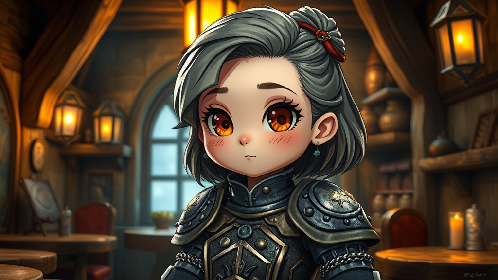 Chibi-style female cleric in chain mail, set in a cozy medieval tavern. The scene is depicted with a warm, indoor lighting reminiscent of Disney and Pixar films, infused with elements from Hayao Miyazaki's fantasy worlds. This character design is a detailed digital painting with cinematic flair, crafted using art principles akin to Mark Ryden and produced with advanced tools like Unreal Engine 5 and Octane Render. She has distinct freckles and a whimsical appearance, set against a creatively imagined tavern backdrop that's both inviting and mysterious. The overall composition captures a blend of hyperrealism with charming fantasy, perfect for showcasing on platforms like ArtStation. Despite the character's whimsical nature, the artwork maintains a sense of detailed realism and magical storytelling.