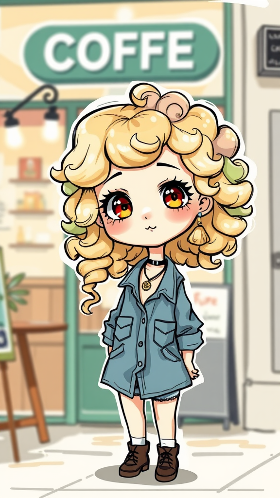 Chibi style illustration of an adorable blonde girl with curly hair, wearing a cute denim shirt and stylish jewelry like a goth necklace and loop earrings. She's standing outside a coffee shop, and the image captures her full body. The overall vibe is charming and playful, hinting at a blend of art styles such as airbrushed and sketch-like qualities. The scene includes a slightly blurry background to maintain focus on the girl, adding a touch of artistic flair. The character design is whimsical, with a slight exaggeration of proportions, complementing the chibi aesthetic while ensuring the figure's anatomy remains appealing and cohesive.