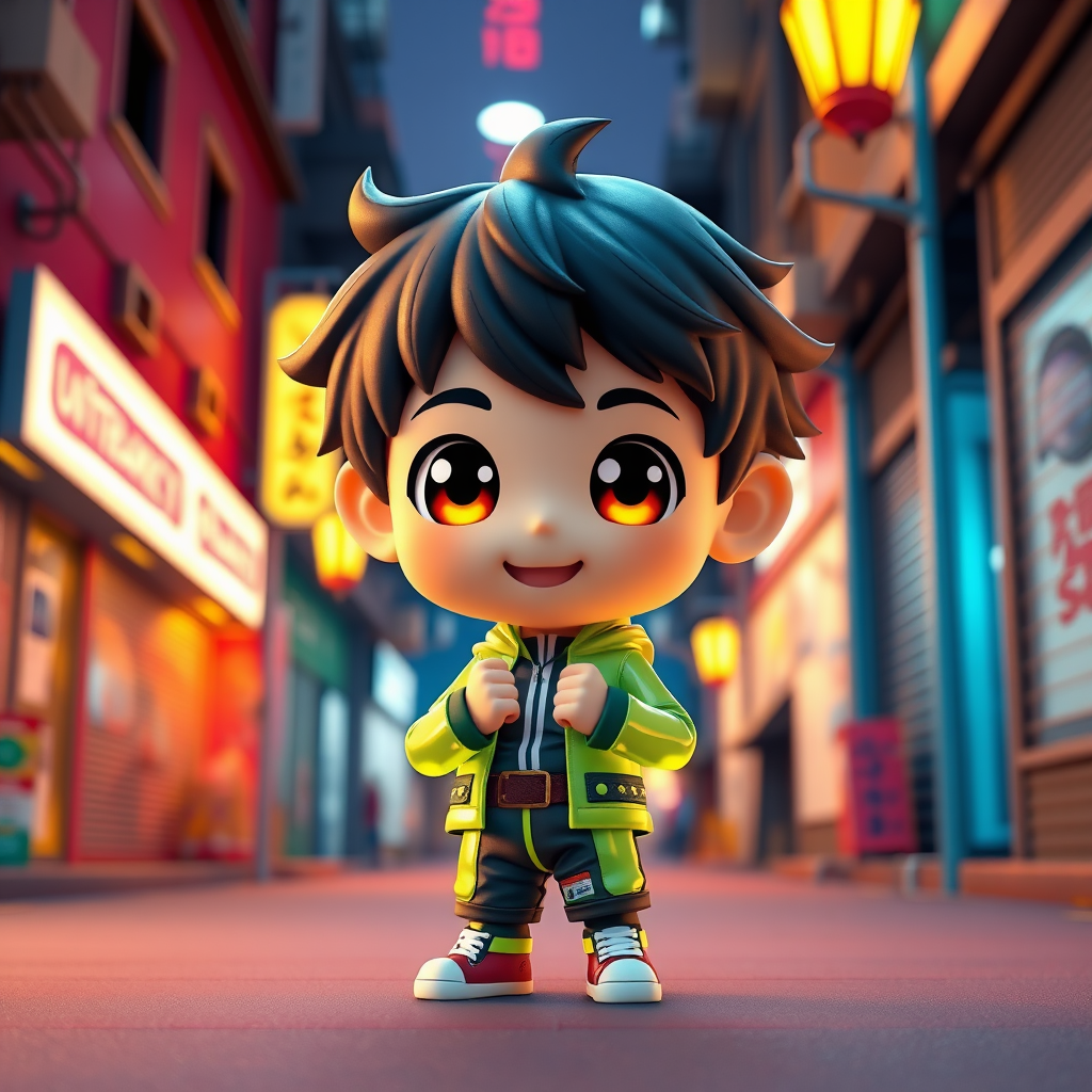 Chibi-style Izuku Midoriya in a vibrant city street scene, crafted as an ultra-cute 3D character with big expressive eyes and an infectious happy demeanor. Set against a solid color backdrop, this 3D rendering in C4D showcases Midoriya as a small, fluorescently translucent, luminous figure—a perfect blend of kawaii doll and pop art influences. Designed with high detail for 8K studio lighting similar to Pixar animations, this character embodies the charm of cute toys and collectible figures. His petite and toddler-like chibi form, with clenched fists and a joyful expression, stands against a magical space warehouse background with bright street lights adding a glow to the scene. Each element, from his meticulously crafted closed-hand fists to the complex details of his playful attire, is rendered with an OC renderer and mixer for an exceptional finish. This depiction avoids common distortions, such as deformed features or extra limbs, maintaining a focus on capturing the essence of fun, warmth, and innocence.