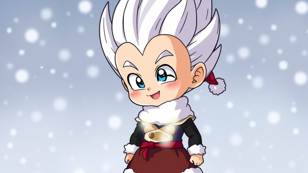 Chibi-style Vegeta wearing a festive Christmas dress with twinkling lights, standing in a snowy background with a playful expression.