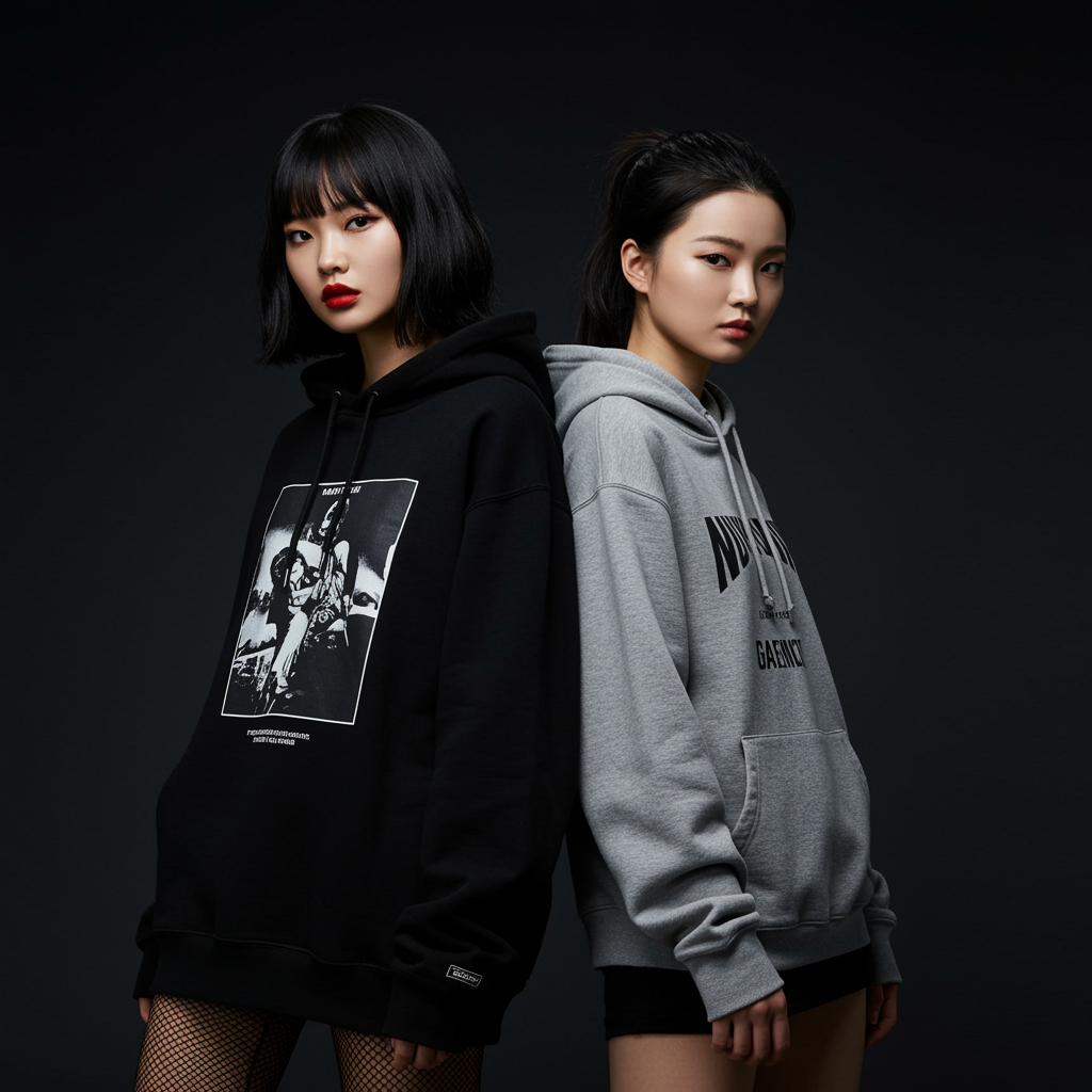 Chic Korean girls posing in stylish hoodies on a dark, modern backdrop, blending urban fashion with sleek aesthetics while showcasing current trends.