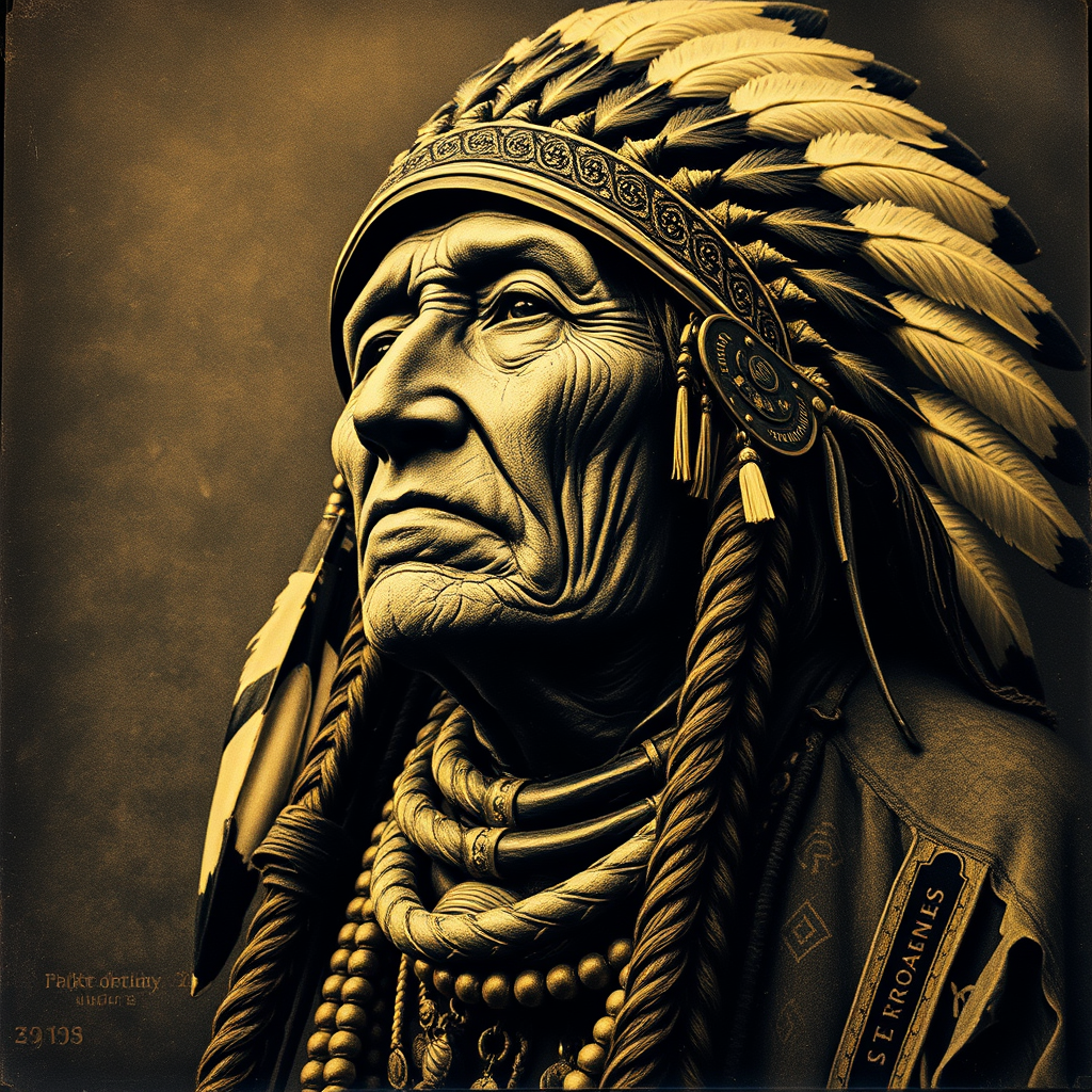 Chief Pepe lithograph from Elk Ridge archives by S, styled as vintage sepia-toned imagery, 32k uhd, infused with deep indigo and silver hues, neo-mosaic aesthetics, wet plate negatives, conveying sharp social commentary, rich in intricate details --ar 179:230 --quality 2 --s 750.