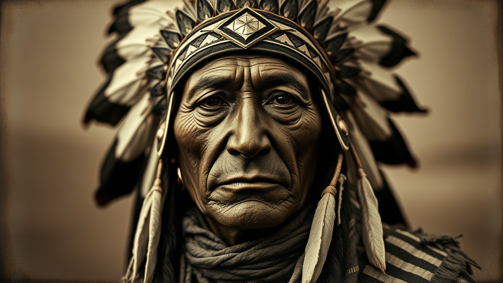 Chief Pepe portrait from Elk Ridge archival series by S, styled as vintage sepia-toned photograph, 32k uhd, dark indigo with silver highlights, neo-mosaic flair, inspired by wet plate negatives, infused with subtle political commentary, rich intricate detailing -ar 179:230 -quality 2 -s 750.