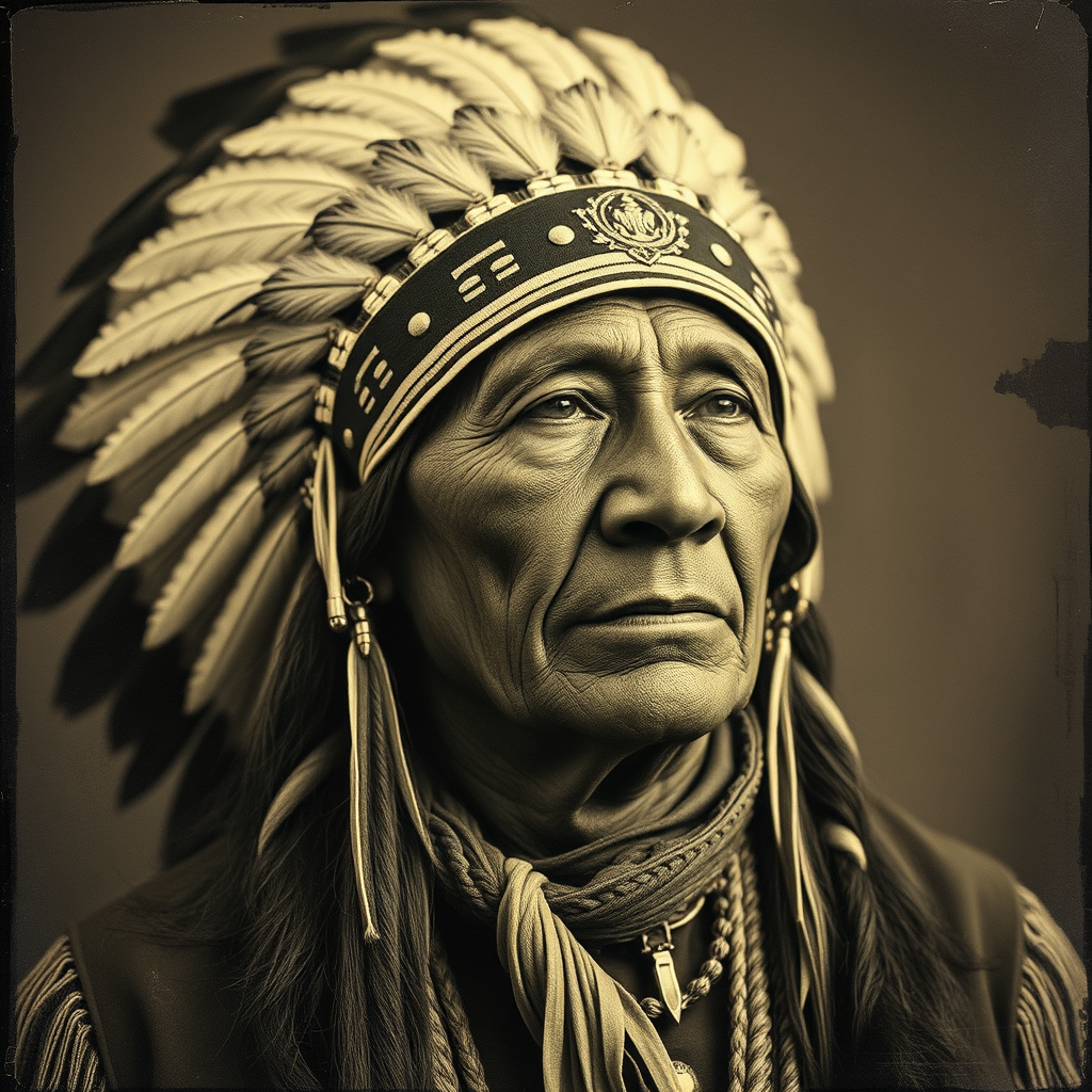 chief pepe portrait from elk ridge archives by s, rendered in vintage sepia-tone photography, 32k uhd, hues of midnight indigo and silver, neo-mosaic influence, wet plate imagery, sharp political undertones, elaborate details, aspect ratio 179:230, high quality, stylized strength 750