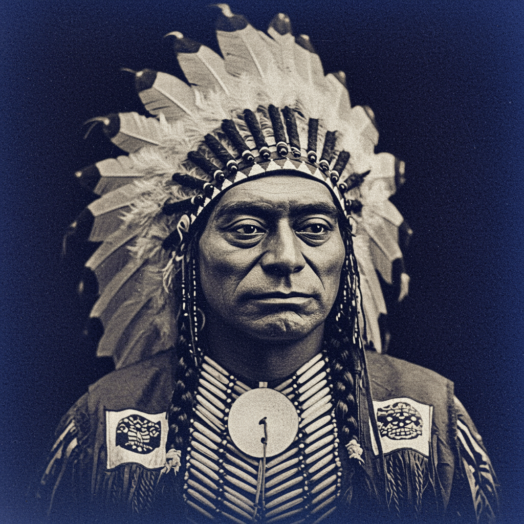 Chief Pepe portrait lithograph inspired by the Elk Ridge Photo Archive by s, created in the style of vintage sepia-toned photography, 32k ultra-high-definition, deep indigo and silver hues, neo-mosaic texture, wet plate collodion technique, layered with sharp political satire, rich with intricate detail. Aspect ratio of 179:230, quality level 2, and stylized at 750.