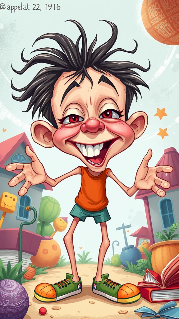 child book character with wildly exaggerated and funny features, caricature-style illustration with vibrant colors, whimsical and playful design, elongated limbs and oversized head, set in a playful cartoon world, highly stylized and imaginative atmosphere, aspect ratio 1:2
