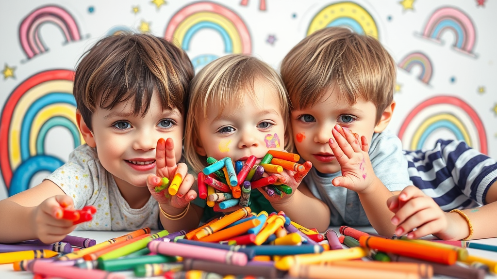 Children enjoying a colorful feast of crayons, their fingers playfully smeared with vibrant hues, amidst a whimsical backdrop of doodled rainbows and stars, capturing a moment of innocent curiosity and creativity in a dreamy, imaginative setting.