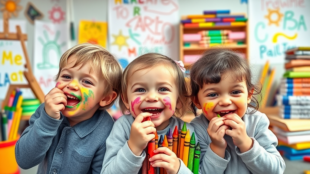 Children joyfully munching on vibrant, colorful crayons, their faces smeared with rainbow hues, amidst a whimsical, oversized art studio backdrop filled with playful drawings and towering stacks of art supplies, capturing the innocence and creativity in a lively and imaginative scene with a 2:1 perspective.