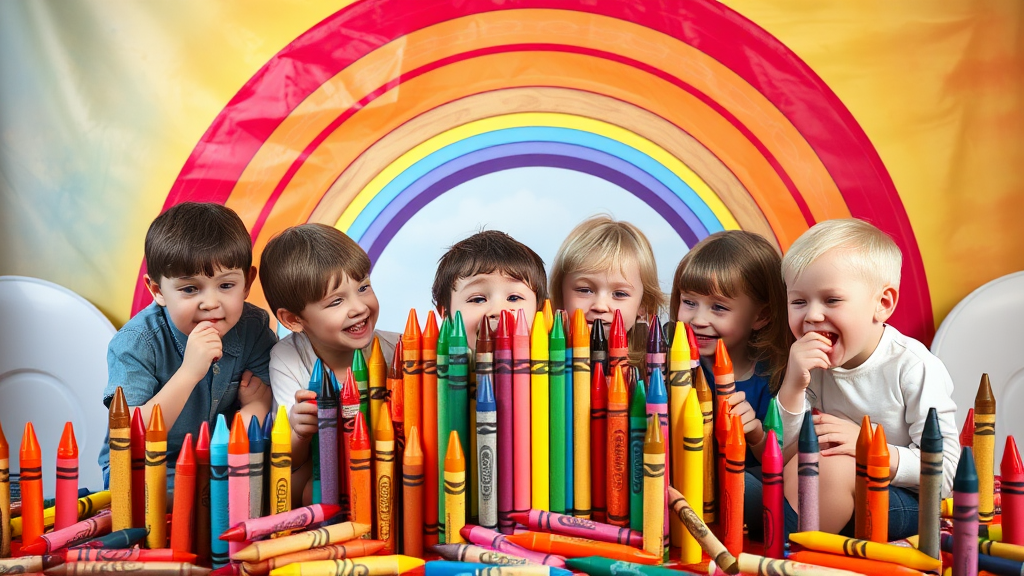 Children playfully surrounded by colorful crayon sculptures, with a few mischievously pretending to nibble on the vibrant wax sticks, all set against a whimsical double rainbow background, reminiscent of a playful art exhibit in a fairy tale world.