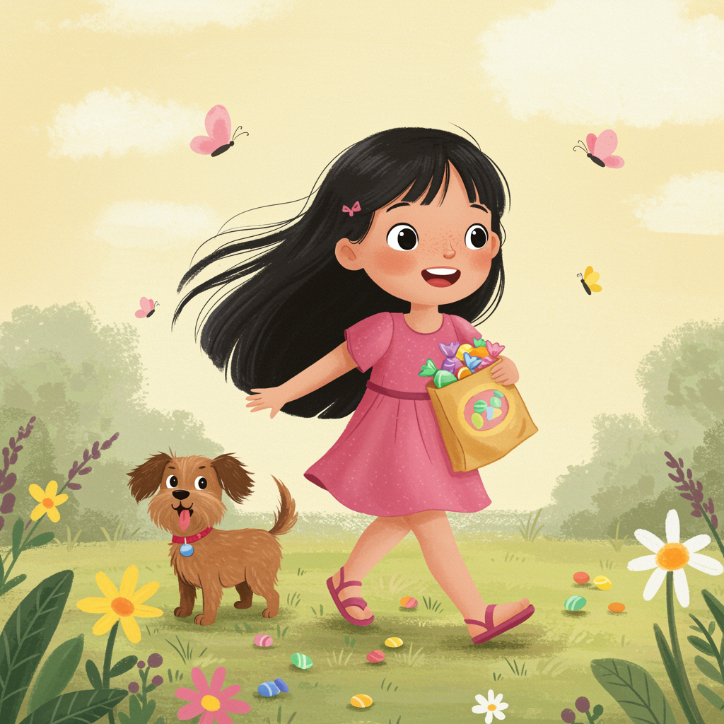 A whimsical children's book illustration featuring a joyful young girl with flowing long black hair, dressed in a vibrant pink dress and sparkly sandals. She walks happily alongside her playful pet dog, whose soft brown fur glows in the warm light. The girl clutches a colorful bag of candies, her face alight with excitement. The scene is painted in soft pastel hues, capturing the innocence and delight of childhood adventures. Subtle butterflies flutter around, adding a magical touch to the serene 2D landscape.