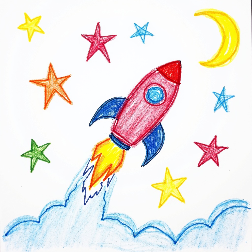 View this AI-generated image featuring a colorful child s crayon drawing on a white sheet of paper features a whimsical rocket ship soaring through a night sky with playful uneven stars and a crescent moon peeking from the corner each element vibrantly brought to life by the bold strokes of crayola