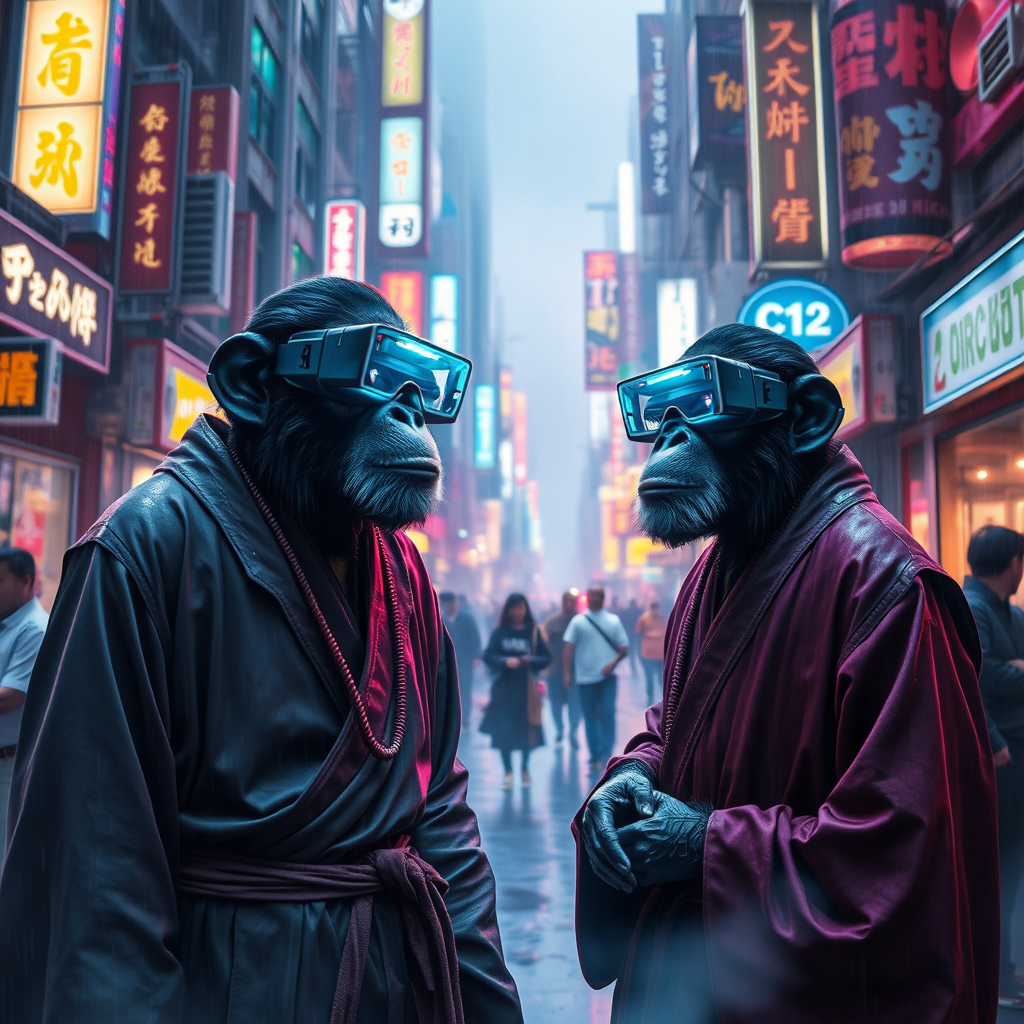 Chimpanzee yakuza adorned in cutting-edge sci-fi AR goggles and zen-inspired robes, hyper-realistic masterpiece in a mystical cyberpunk cityscape, vibrant neon lights reflecting off rain-slick streets, bustling futuristic ambiance, slight mist swirling around, revealing hidden digital signage and avant-garde architecture, subtle creative flair woven into the fabric of this urban symphony.