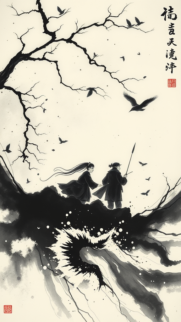 China black ink painting in the style of Kazuki Takamatsu, with loose yet evocative compositions inspired by Théodore Géricault, incorporating elements of letras y figuras. Gestural and dynamic in nature, the artwork features tightly cropped scenes that focus on fluidity and movement, capturing the essence of fleeting moments. The composition blends traditional techniques with modern interpretations, maintaining a balance between detail and abstraction, while allowing for a heightened stylization, conveying a sense of depth and emotion throughout.