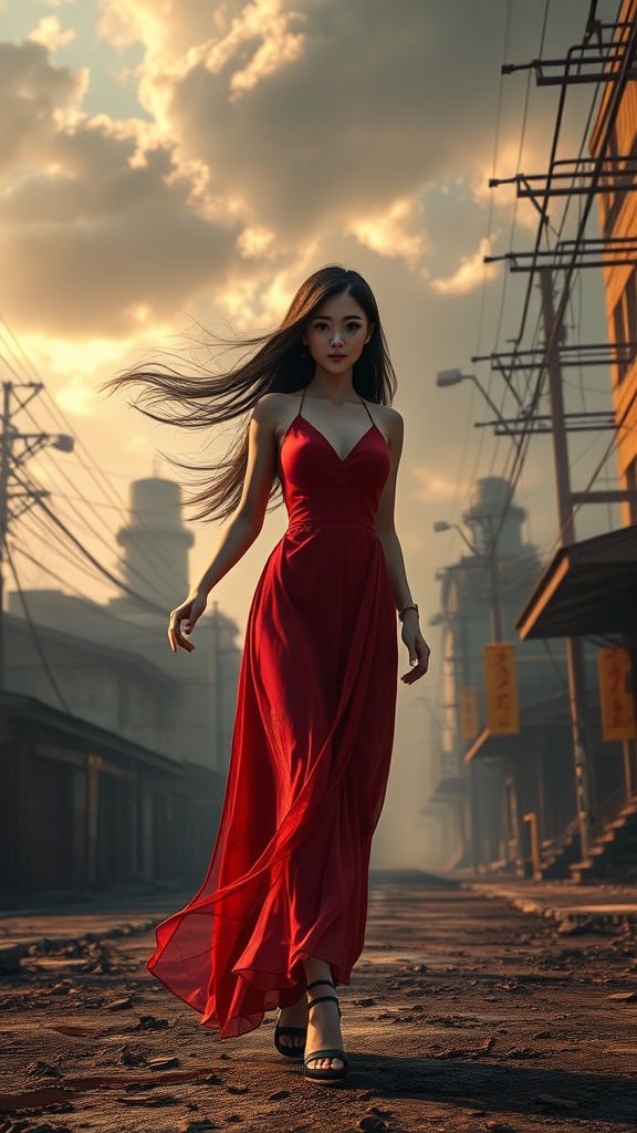 Chinese girl with flowing hair, elegantly walking with grace, captured in rich detail, digital art style. The scene is illuminated with dramatic, web-movie lighting, achieving studio quality and smooth rendering akin to Unreal Engine 5 and Sinting's superior capabilities. The backdrop features rusty, dystopian streets under smoke-filled skylines, depicting cities in decay and desolate avenues. Ominous cloud-lit skies create a fantasy art atmosphere with dramatic lighting and soft detail. Utilize the essence of film and ray tracing for sharp, focused illustration. Presented in 8k HD and ultra-wide format, capturing every nuance with exceptional clarity.