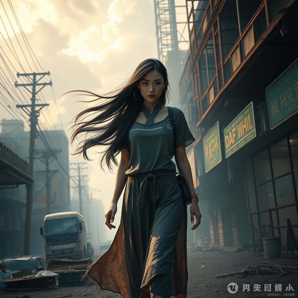 Chinese girl with flowing long hair, captured in a walking posture amidst rusty dystopian streets, enveloped by smoke-filled skylines and deteriorating cityscapes. The scene is rendered in exquisite digital art with dramatic, studio-quality lighting akin to a web movie. The atmosphere is filled with soft yet ominous cloud-lit fantasy elements, accentuated by Unreal Engine 5's Unrealistic detailing and Sintan-style rendering. The desolate streets evoke a surreal cinematic feel, enhanced by sharp focus and ray-tracing techniques. This illustration, presented in 8k HD, ultra-wide format, conveys a haunting yet mesmerizing dystopian world in vivid, crisp detail.