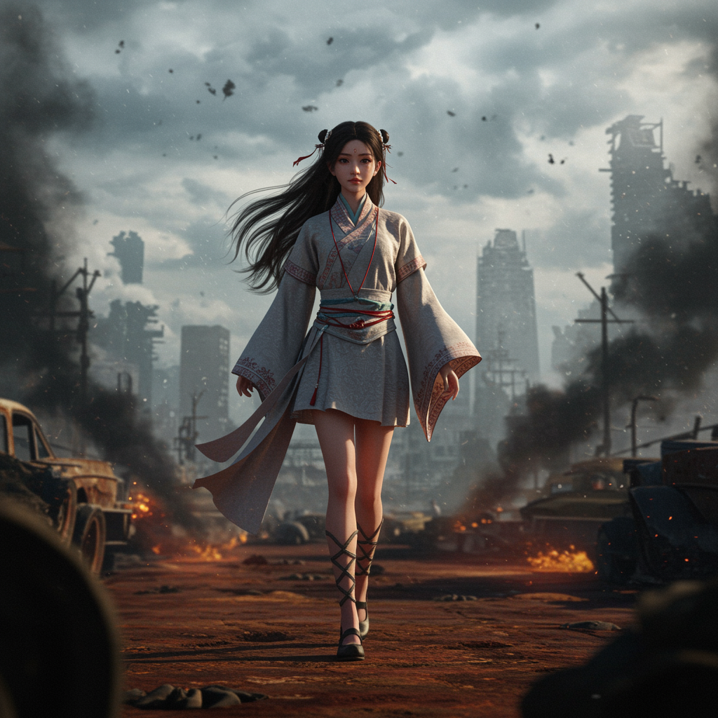 Chinese girl with flowing long hair, captured in a graceful walking posture, rendered with exceptional detail as digital art. Illuminated by cinematic web-movie lighting at studio quality, this piece uses Unreal Engine 5 and Sinting Rendering to create a surreal scene. She navigates through rusted, dystopian streets, surrounded by smoke-filled skylines and crumbling cityscapes. Against desolate streets and ominous, cloud-lit fantasy backdrops, dramatic lighting casts soft yet vivid detail across the illustration. Employing advanced film techniques, including ray-tracing, this artwork boasts sharp focus and ultra-wide, 8k HD clarity, offering a breathtaking visual narrative.