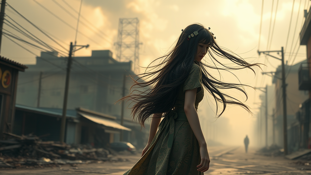 Chinese girl with flowing long hair, characterized by a graceful walking posture, depicted in super detail through digital art. The scene captures the essence of a cinematic web movie with studio quality and smooth rendering. Imagine the precision of Unreal Engine 5, enhanced by sinting rendering techniques. She navigates through rusty dystopian streets under a smoke-filled skyline, amidst deteriorating urban landscapes and desolate roads. The atmosphere is charged with ominous, cloud-lit fantasy art, featuring dramatic lighting and soft details. This vision is further brought to life through sintan film techniques, utilizing ray-tracking for a sharp, focused illustration. Visualize it in 8k HD, ultra wide for breathtaking clarity and depth.