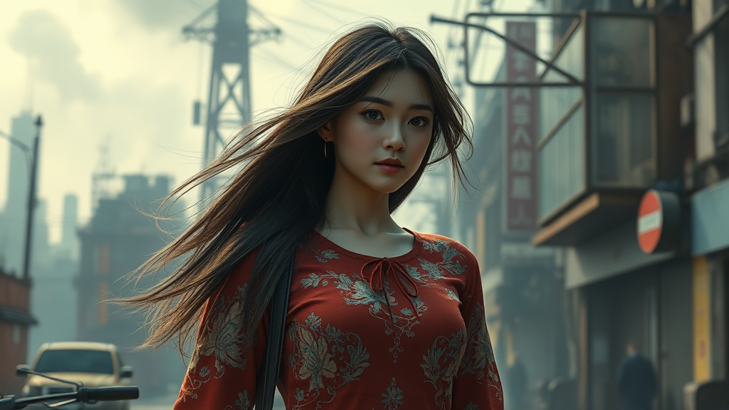 Chinese girl with flowing long hair, showcased with a confident walking posture, surrounded by the intricate detail of digital art. The scene captures the ambiance of a cinematic web movie with studio quality and smooth rendering techniques. Rendered in Unreal Engine 5, the imagery exudes the unique characteristics of Sinting Rendering. The backdrop features rusty dystopian streets, shrouded by smoke-filled skylines, with cityscapes quietly deteriorating and streets eerily desolate. An ominous cloud-lit fantasy atmosphere envelops the scene, enhanced by dramatic and filmic lighting. Soft details blend with sharp, ray-tracked illustrations, all captured in stunning 8k HD ultra-wide resolution; the overall effect is a mesmerizing fusion of creative elements.