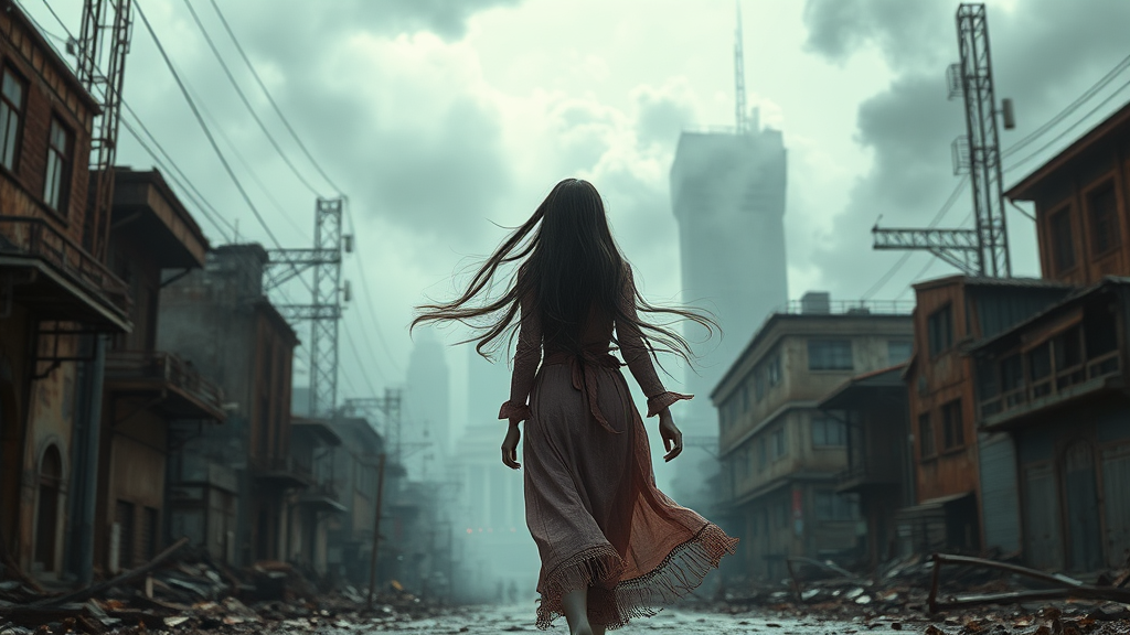 Chinese girl with flowing long hair, walking gracefully through deteriorating, dystopian streets, captured in intricate detail. This digital art piece presents a cinematic scene with studio-quality, smooth rendering reminiscent of Unreal Engine 5 and Sinting Rendering techniques. Smoke-filled skylines loom over a city in decay, while the desolate streets echo with an unsettling calm. The atmosphere is heightened by ominous cloud-lit skies, blending fantasy with reality. Dramatic and soft details play with sharp focus and ray-traced lighting, creating an evocative illustration. Rendered in 8k HD and ultra-wide format, this artwork brings to life the ethereal beauty against a backdrop of rusting urban ruins.