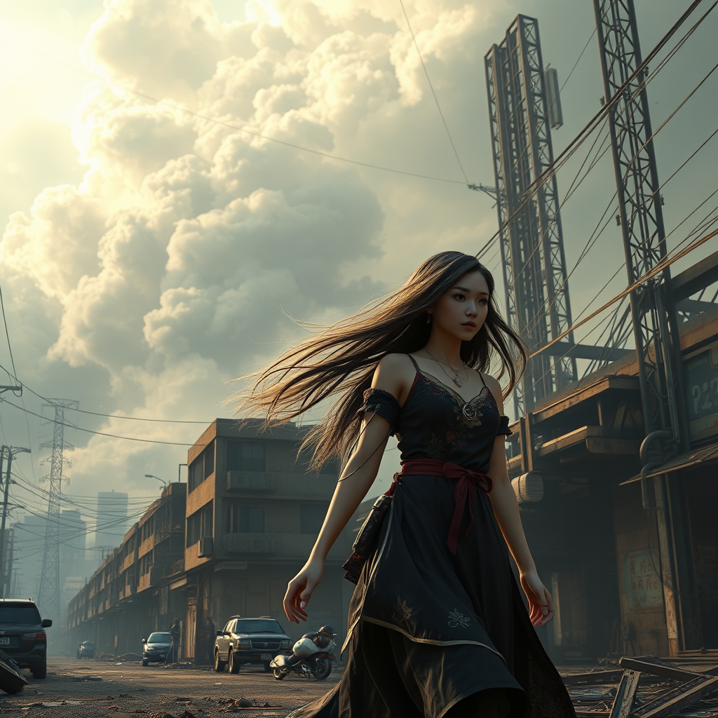Chinese girl with long, flowing hair, captured in a dynamic walking posture, amidst rusty, dystopian streets. The digital artwork features a super detailed composition with studio-quality craftsmanship. Rendered using Unreal Engine 5, the scene exhibits sinting quality, integrating smoke-filled skylines that loom over deteriorating cities and desolate streets. The ominous, cloud-lit fantasy atmosphere is accentuated by dramatic lighting and a soft touch to details, reminiscent of high-end film ray-tracing techniques. The illustration boasts sharp focus and an 8k HD ultra-wide format, delivering an immersive, cinematic experience.