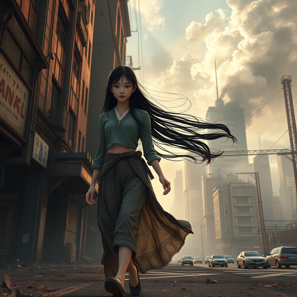 Chinese girl with long flowing hair in motion, captured in a highly detailed digital art style, walking with purpose amidst rusty, dystopian streets. The scene is bathed in dramatic web movie lighting and crafted with studio-level quality, featuring smooth rendering akin to Unreal Engine 5 and Sinting techniques. The city's skyline is filled with smoke, reflecting a deteriorating, desolate landscape under ominous, cloud-lit skies. This fantasy art piece employs exceptional ray-tracing for dynamic lighting effects, capturing the atmosphere with soft yet sharp detail. The illustration boasts 8k HD ultra-wide resolution, promising a cinematic feel with sharp, focused clarity.