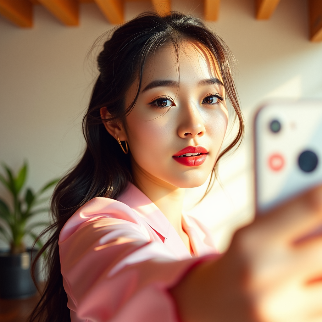 Chinese model takes a vibrant selfie, capturing the essence of social media influencers, with hints of vintage webcam aesthetics and the artistic touch of Felicia Simion. The photo, reminiscent of Provia film, showcases a harmonious blend of hinchel lighting and a glossy, polished finish. The composition, set in an elongated aspect ratio of 68:128, exudes a refined stylization with dynamic elements and a contemporary vibe.