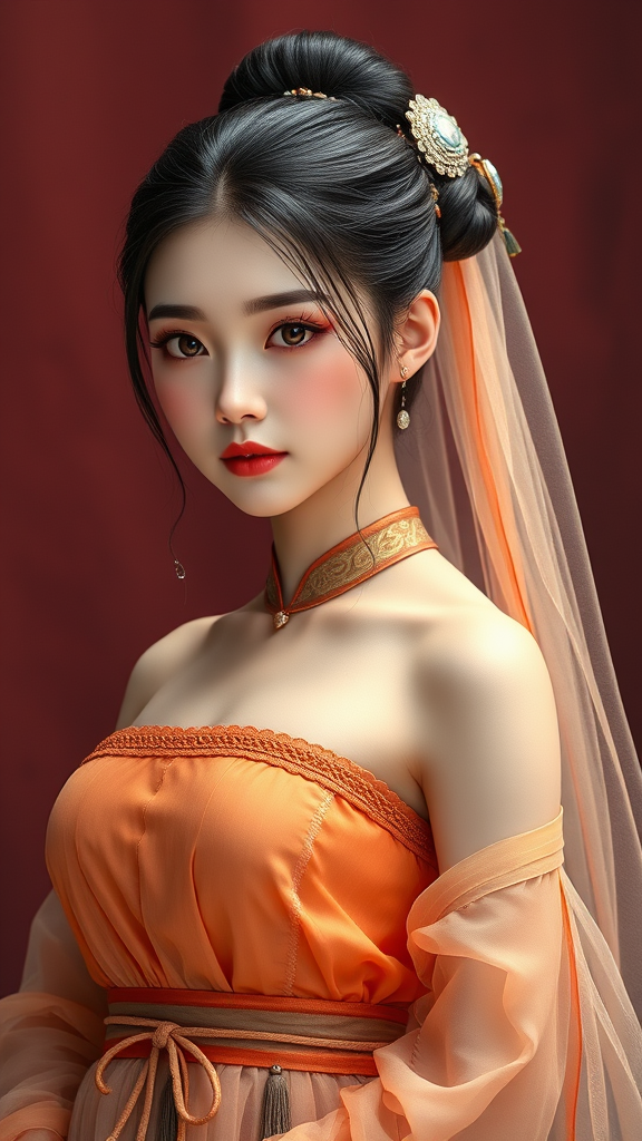 Chinese Tang Dynasty Beauty, single girl, face with inverted triangle shape, graceful ballerina bun, direct gaze towards the viewer, enchanting features, adorned in luxurious silk attire, tulle dress complemented by an apron, stylish tube top, cinched with a decorative belt, soft veil, orange sleeveless top, flowing skirt below, set against a rich dunhuang backdrop, eyes with a touch of sorrow and melancholy, tears glistening, expression of contemplation and delicate uncertainty, exquisite and alluring, ethereal presence reminiscent of a fairy descending, photorealistic with a dreamlike, wistful atmosphere.