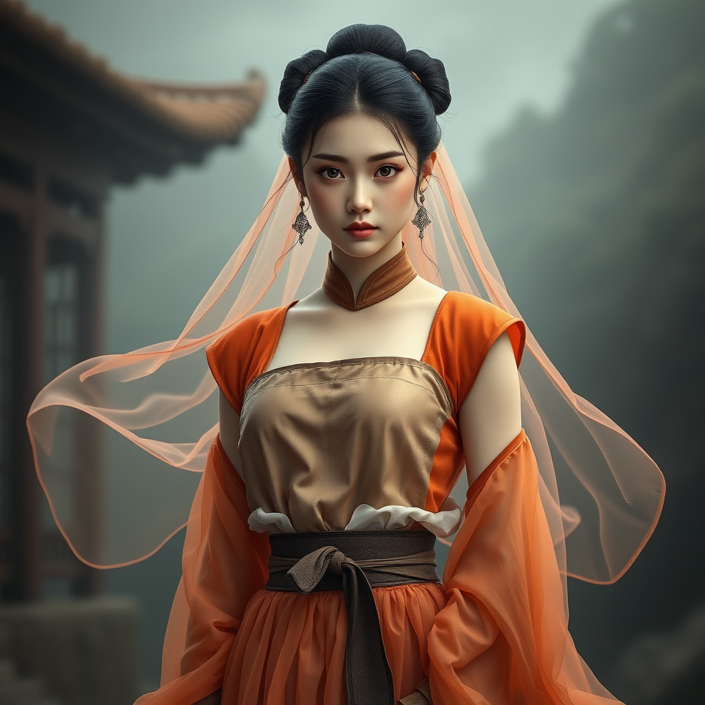 Chinese Tang Dynasty Beauty, single girl with an inverted triangle face and ballerina bun, gazing directly at the viewer with a beautiful and delicate face. Dressed in an exquisite blend of silk and tulle, she wears an apron, tube top, and flowing loose skirt accented with a belt. An orange sleeveless top drapes over her shoulders as a sheer veil cascades around her. Set against a mystical Dunhuang backdrop, her sad eyes and melancholy expression convey a deep sense of indecision and tender charm. Tears glisten in her eyes as if a fairy has descended, capturing a photorealistic glimpse of her hauntingly lovely and somber presence.