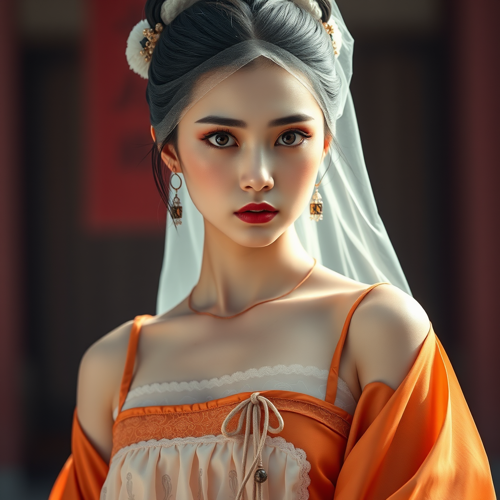 Chinese Tang Dynasty Beauty, young woman solo, Inverted Triangle Face, Ballerina Bun, gazing at the viewer, strikingly beautiful features, elegant silk attire, tulle dress, apron, tube top, intricately tied belt, delicate veil, vibrant orange sleeveless top, flowing loose skirt, backdrop reminiscent of Dunhuang, eyes tinged with sadness, a melancholic expression, tears glistening, gaze set forward, caught in indecision, exquisitely delicate and charming, ethereal presence as if a Fairy descends, hyper-realistic dreamlike atmosphere.