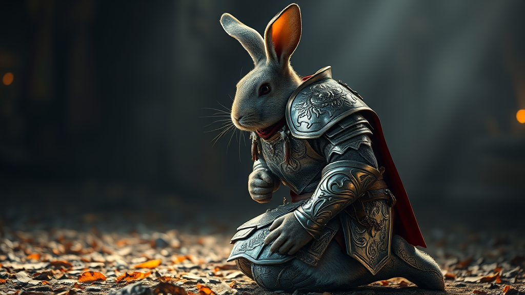 Chivalrous rabbit warrior kneeling with grace, adorned in exquisitely detailed armor featuring an elaborate design of shimmering silver intertwined with fine silk accents, set aglow under dramatic cinematic lighting, captured in stunning detail and vibrant resolution.