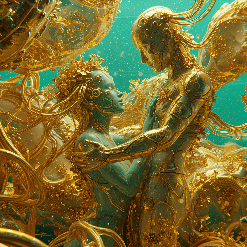 christiano v inspired visual fiction, blending sci-fi with romance, in the style of franciszek starowieyski, featuring an exquisite palette of gold and cyan. Hyper-realistic illustrations combine organic sculpting with romantic fantasy, reminiscent of android jones' intricate detail. The artwork captures ethereal lovers entwined within futuristic landscapes, where organic forms merge seamlessly with advanced technology, producing a dreamlike atmosphere filled with emotion and intricate design.