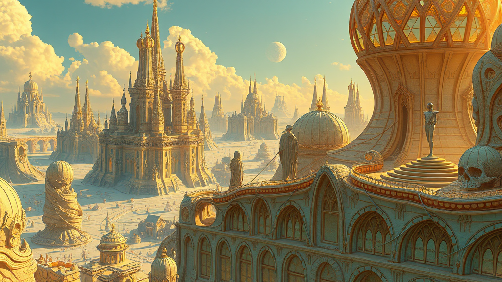 Christiano V-inspired visual fiction in the style of Franciszek Starowieyski, merging gold and cyan tones to create hyper-realistic sci-fi and romantic fantasy illustrations. This work captures the essence of organic sculpting, drawing subtle influences from Android Jones, blending hyper-realistic environments with a touch of romanticism. The imagery showcases a harmonious fusion of futuristic landscapes, intricate character designs, and emotionally evocative scenes that transport viewers into a dreamlike world.