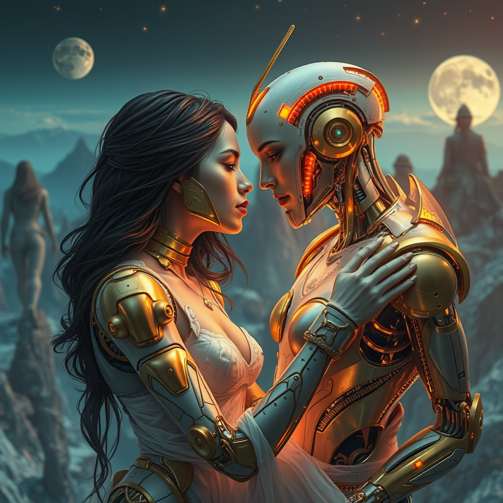 Christiano V-inspired visual fiction, reflecting the essence of Franciszek Starowieyski, blending hyper-realistic sci-fi with romantic fantasy. Gold and cyan hues illuminate the scene, featuring organic sculpting evoking the magic of Android Jones. Envision romantic illustrations where surreal worlds intertwine, androids and figures locked in dreamy intimacy amidst futuristic landscapes—crafted with an artful balance of imagination and emotion in an elongated aspect ratio of 32:31.