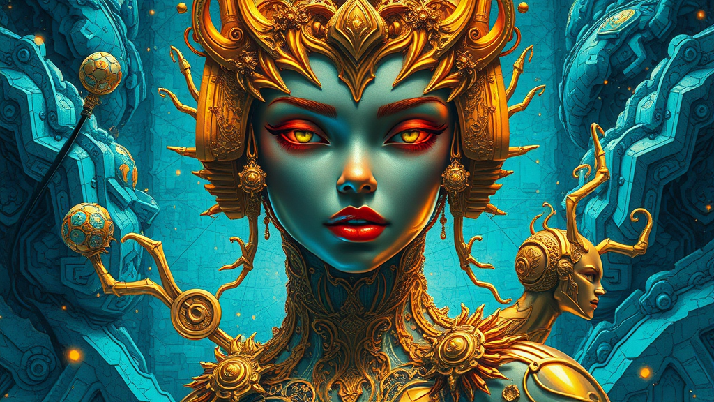 Christiano V-inspired visual fiction, visual artist, illustrator, in the evocative style of Franciszek Starowieyski, blending opulent gold and vibrant cyan, creating hyper-realistic sci-fi imagery. Infused with romantic fantasy and organic sculpting, akin to the visionary approach of Android Jones, the illustrations exude a blend of romanticism and futuristic aesthetics.
