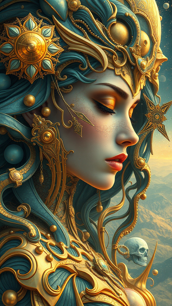 Christiano V-inspired visual fiction, visual artist, illustrator, in the style of Franciszek Starowieyski, featuring gold and cyan hues, hyper-realistic sci-fi elements, romantic illustrations with organic sculpting, echoing Android Jones's style, romantic fantasy themes intertwined with futuristic visions, intricate and fluid forms, dynamic contrasts, ethereal landscapes, surreal depth, and a narrative woven with emotion, exploring the beauty of otherworldly love and cosmic connections within the expansive universe.