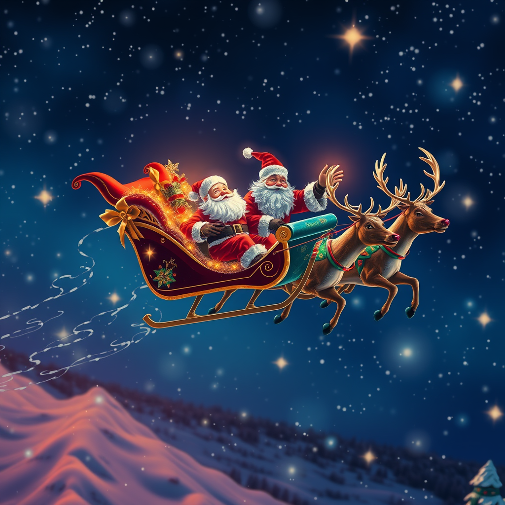 Christmas card featuring a lively and energetic Santa Claus in his sleigh, soaring through the night sky, rendered in vibrant 32k UHD quality. The scene is full of excitement, with reindeer elegantly pulling the sleigh amidst twinkling stars, capturing the quadratura style with dramatic depth and perspective. The composition is bursting with color and warmth, evoking a sense of wonder and joy as Santa spreads holiday cheer. The atmosphere is a magical blend of chaos and harmony, encapsulating the festive spirit in an enchanting vertical 9:16 aspect ratio.