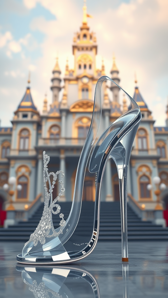Cinderella's exquisite crystal clear stiletto heel, set against the majestic backdrop of the royal palace, 4 ultra-realistic 3D renderings, high-quality, intricately detailed, professional execution using 3D Studio Max and V-Ray, by Stanley Artgerm Lau, featuring realistic textures and precise measurements, showcasing multiple perspectives, artistic embellishments, elegantly adjusted, maintaining core essence, with subtle creativity, softness and grace, highlighting elegance, sophistication, award-winning visuals, capturing the ethereal charm of a fairy tale moment, slight distortion for a unique artistic touch, capturing the allure of a fantastical dream world, cinematic and immersive.
