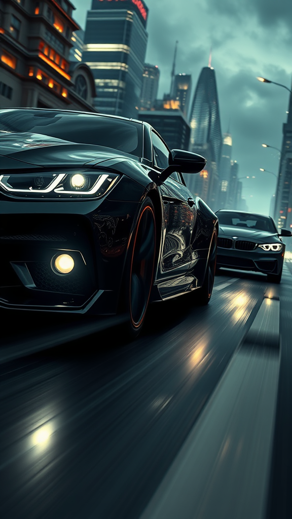 Cinematic 8k scene featuring three sleek black cars, rendered with intense realism and aesthetic flair, their xenon headlights piercing the night as they race in close formation. The cars are portrayed in full view, exhibiting an intricate and ornate design, set against an ultra-detailed digital painting of a lavish cityscape. The road beneath them is a blur of motion, emphasizing speed and energy. The composition is centered, enhancing the dramatic impact, with reflections shimmering in the dark, epic atmosphere. Atmospheric lighting creates a vivid contrast, highlighting the subsurface scattering on the cars. This hyper-realistic and cinematic artwork boasts an intense and dynamic composition, perfect for promotional art. Rendered with the highest level of detail quality, the scene proficiently employs overcast reflection mapping and volumetric lights to immerse the viewer in a dark environment. Created with movie-quality VFX, the render is hyper-detailed in 4k and 8k resolution, captured from a low angle for added intensity. Utilizing the power of Unreal Engine 5 and Cinema4D, the piece is completed with a Redshift render, ensuring an unrivaled 8k visual feast.