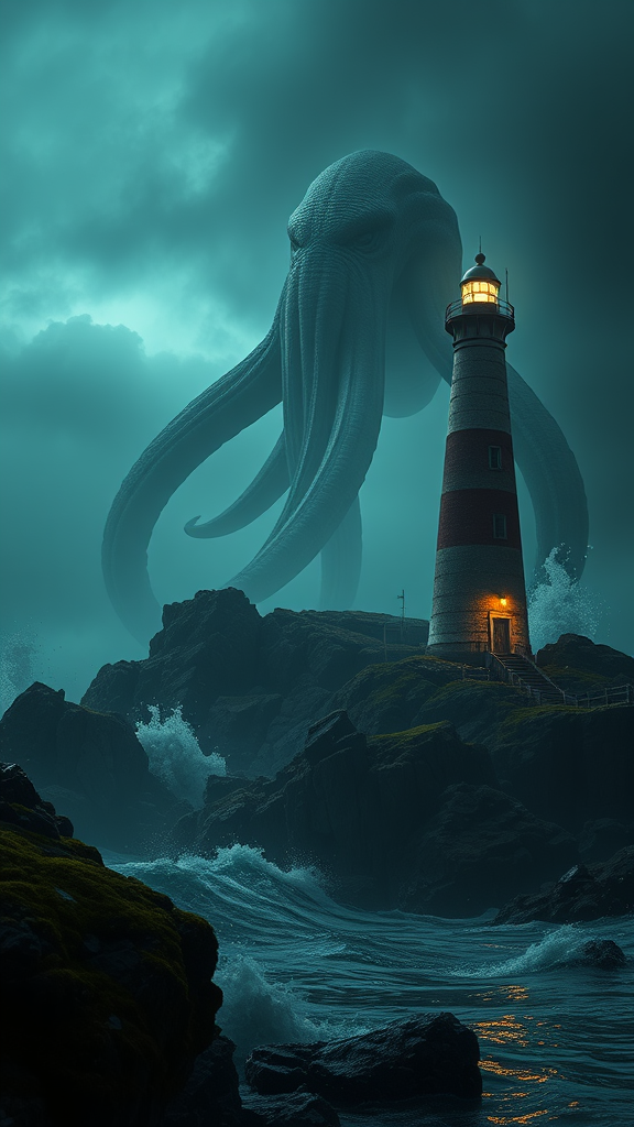 Cinematic 8k wallpaper capturing a colossal Cthulhu, positioned prominently near a tall lighthouse on rugged, moss-covered rocks amidst a turbulent sea. The scene is sharply focused and evokes megalophobia, presented as an extremely detailed 4k digital painting. Cthulhu's form exudes a soft, organic glow, imbuing the photorealistic atmosphere with a cinematic, movie-quality depth. The dark and moody ambiance is enhanced by intricate lumen reflections and atmospheric lighting, with subsurface scattering contributing to its hyperrealism. Every element is insanely detailed, achieving a highly realistic and detailed photo quality of up to 64k UHD. The composition embodies the clarity of a high-end DSLR, rendered sharply with the power of Unreal Engine 5 and Octane Render in stunning 8k. Small creative enhancements include swirling mist around the lighthouse and slightly illuminated ocean waves reflecting the creature's glow.