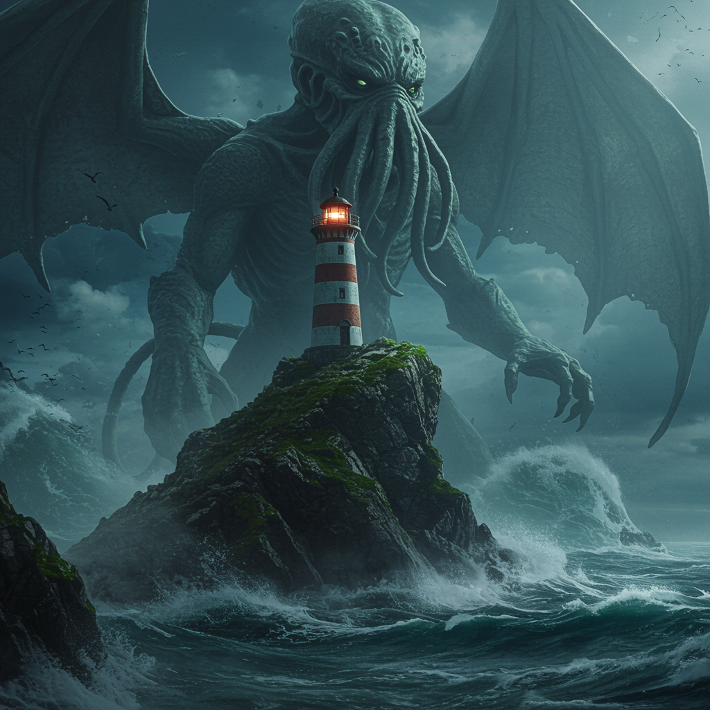 Cinematic 8k wallpaper, colossal Cthulhu looming over a lighthouse perched on a rugged, moss-covered rock, turbulent sea swirling around, sharp focus, inducing megalophobia, intricately detailed 4k digital painting, subtle organic luminescence, photorealistic, cinematic, movie-quality visuals, dark and moody ambiance with lumen reflections, atmospheric lighting, detailed subsurface scattering, hyperrealism, exceptionally detailed, highly realistic 64k UHD imagery, captured with DSLR clarity, precise focus, powered by Unreal Engine 5, enhanced with Octane Render, 8k resolution, ethereal mist swirling in the air, adding a sense of otherworldly mystery.