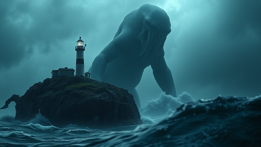 Cinematic 8k wallpaper, colossal Cthulhu rising amidst a storm near a lighthouse perched on a craggy, moss-covered rock; the turbulent sea crashing below. Sharp focus captures the monstrous details with a light organic luminescent glow. The scene is photorealistic, with a movie-quality atmosphere, featuring dark, moody tones and lumen reflections in the water. Atmospheric lighting enhances the scene with subsurface scattering effects, while hyperrealism provides intricate textures on Cthulhu's skin. The setting is exquisitely captured in highly detailed photo quality, using advanced visual engines for a vibrant, lifelike depiction that invokes megalophobia. DSLR quality sharpness, rendered in unreal engine 5 and octane, capturing every feature of this massive entity in breathtaking 8k.