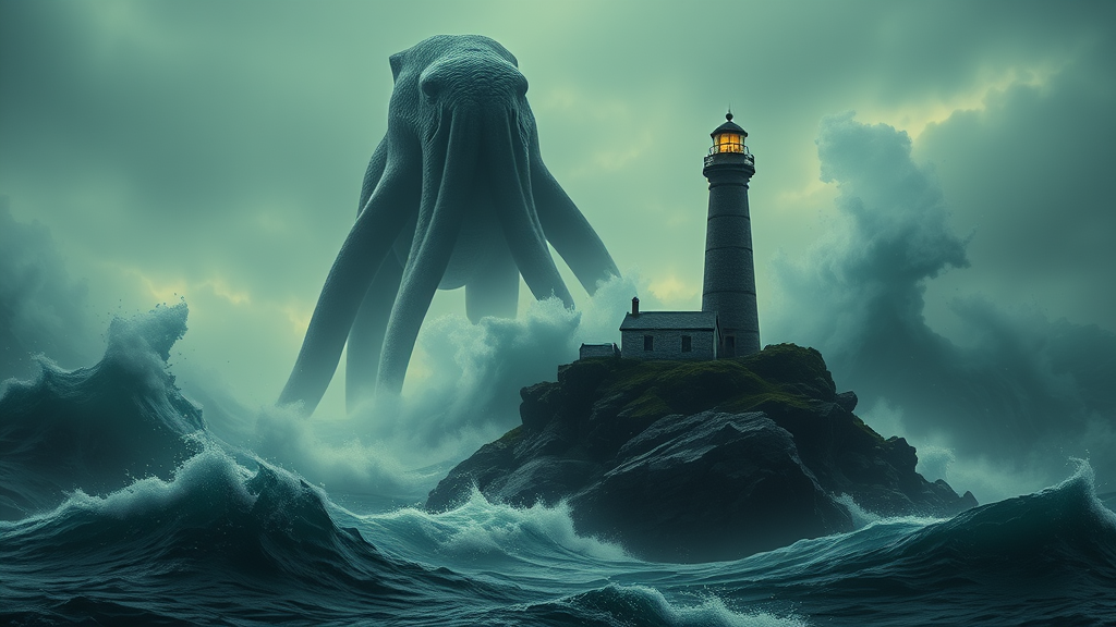 Cinematic 8k wallpaper featuring a colossal Cthulhu towering near a lighthouse perched on a mossy rock amidst a violently stormy sea, captured with sharp focus. The scene is imbued with megalophobia, showcasing an extremely detailed 4k digital painting that boasts a subtle organic glow. This photorealistic composition radiates cinematic, movie-quality aesthetics with a dark, moody atmosphere. Lumen reflections dance gracefully across the water, enhancing the atmospheric lighting and subsurface scattering to achieve hyperrealism. The image is insanely detailed, resembling a highly realistic photo captured in 64k UHD clarity, with precision akin to a DSLR camera. Developed using Unreal Engine 5 and Octane Render techniques in 8k resolution, the scene is subtly altered to include soft bioluminescent accents on the Cthulhu, which contrast mesmerizingly against the tumultuous waves and create a captivating, immersive visual experience.