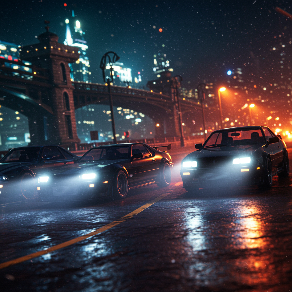 Cinematic 8k wallpaper featuring three black cars with an incredibly realistic design; the scene is set during a thrilling night race with xenon headlights illuminating their path as they maneuver closely together. The cars are fully showcased with exquisite and intricate details, surrounded by an ornate, highly detailed cityscape. The road exhibits motion blur, enhancing the sense of speed, while the centered composition presents dramatic lumen reflections. The dark epic scene is amplified through atmospheric lighting and subsurface scattering, creating a hyperrealistic effect. The intense cinematic composition serves as promotional art, boasting ultra-high detail quality and realism. Overcast reflection mapping adds depth, with volumetric lights piercing the dark setting. The scene, reminiscent of movie quality due to VFX post-production, is rendered in HD, HDR, 4k, 8k. Captured from a low angle, this remarkable visual experience is created with Unreal Engine 5 and Cinema4D, featuring a redshift render in 8k.
