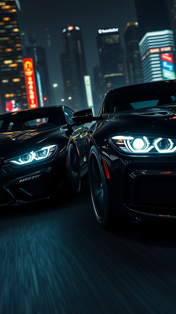 Cinematic 8k wallpaper featuring three sleek black cars in an intensely realistic and detailed digital painting, showcasing their aesthetic allure. The xenon headlights are blazing as they race closely at night, with the cars in full view, spotlessly capturing intricate designs and ornate details against a lavishly detailed city backdrop. The road beneath them blurs in motion, with a centered composition highlighting impressive lumen reflections. The scene is dark and epic, enveloped in atmospheric lighting and subsurface scattering, embodying hyperrealism with an intense cinematic composition suitable for promotional art. Captured with ultra detailed, hyper-realistic quality, it offers an overcast reflection mapping, set against volumetric lights in a dim environment. This low-angle view mirrors movie-quality VFX post-production, rendered in Cinema4D with Redshift in Unreal Engine 5, presented in breathtaking 8K resolution.
