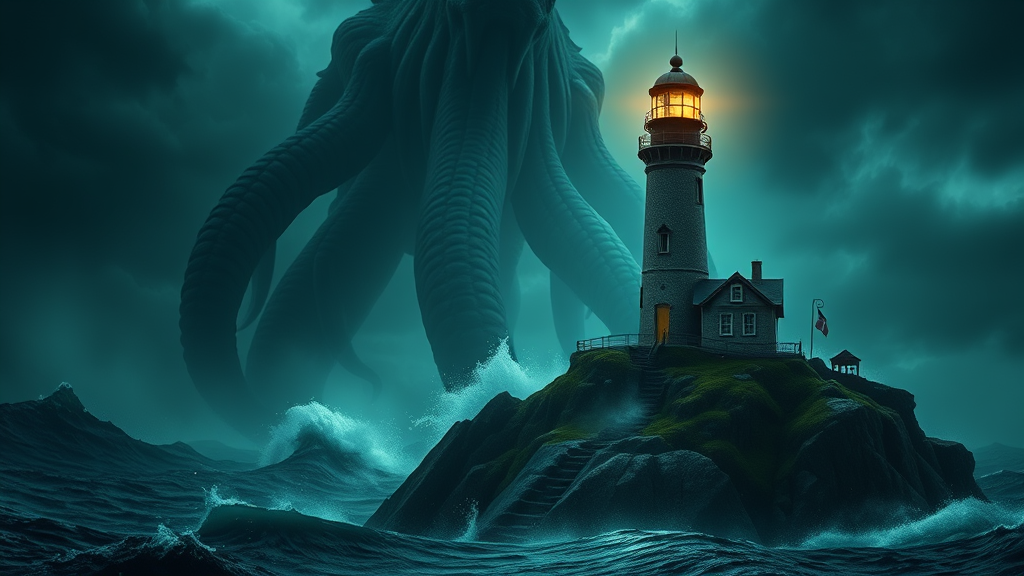 Cinematic 8k wallpaper of a colossal Cthulhu towering near a vintage lighthouse perched on a moss-covered rock; the sea churns violently in a storm. The composition is centered with a sharp focus showcasing an atmosphere of megalophobia. An extremely detailed 4k digital painting captures a subtle, organic glow emanating from the creature, enhancing the photorealistic and cinematic movie quality. The scene is dark and moody, with dramatic lumen reflections and atmospheric lighting highlighting every intricate detail. Subsurface scattering and hyperrealism enhance the texture and depth, creating an insanely detailed, highly realistic photo reminiscent of 64k UHD quality. Modeled with the precision of a DSLR photograph, it leverages the power of Unreal Engine 5 and an Octane render for an unmatched 8k experience with slight atmospheric variations enhancing the mystique.