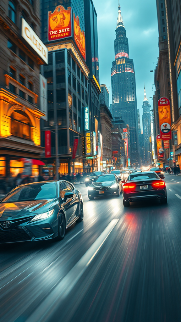 Cinematic 8k wallpaper of cars in a high-speed race through an intricately detailed city, captured with extreme 4k digital painting precision; showcasing an ornate urban landscape with dynamic motion blur and stunning lumen reflections. Atmospheric lighting enhances the scene with hyperrealism, creating an intense cinematic composition akin to promotional art. This piece trends on Instagram and Tumblr, boasting an f/1.8 aperture and 85mm perspective for ultra-detailed realism. Movie-quality visuals with VFX post-production result in hyper-detailed, HD, HDR imagery. Utilizing Unreal Engine 5 and Cinema4D with Redshift rendering, the artwork includes film grain for added depth, maintaining 8k quality throughout.