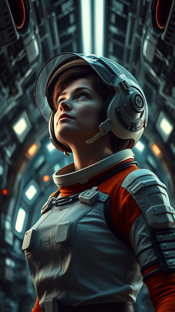 Cinematic 8k wallpaper of Ellen Ripley from Alien movie, wearing an astronaut suit with helmet on and visor closed, gazing upwards in an action-ready stance, set against the intricate and industrial interiors of the Nostromo spaceship. Features sci-fi elements with ray tracing, showcasing ultra detailed and hyper realistic visuals. The lighting captures dramatic chiaroscuro and epic realism, akin to promotional art. Includes overcast reflection mapping and rim light effects for a high-definition, stoic cinematic feel. The scene echoes movie quality and is shot with ultra realistic textures, reminiscent of being shot on a Canon 5D and rendered with octane in 8K.