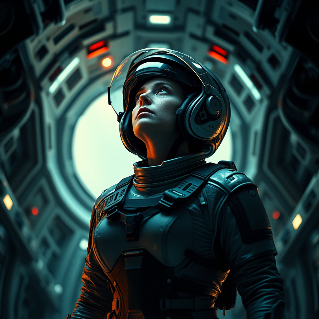 Cinematic 8k wallpaper of Ellen Ripley from the Alien movie, clad in a futuristic astronaut suit with her helmet on and visor reflecting a subtle glow, gazing skyward in a heroic stance. She stands within the Nostromo's intricate space shuttle interiors, immersed in a sci-fi ambiance. The scene is illuminated with advanced Ray Tracing, enveloping Ripley in ultra-detailed chiaroscuro lighting. The ultra-realistic, promotional art features an overcast reflection mapping effect, capturing every detail with hyperphotorealistic precision. Her determined expression is highlighted by a dramatic rim light, conveying stoic resolve. The setting is composed with epic movie quality, reminiscent of an ultra-realistic photograph shot on a Canon 5D, rendered with the unparalleled depth and clarity of Octane Render, at an astonishing 8K resolution. Small accents of vibrant colors and texture breath life into the sci-fi setting, adding a hint of originality while preserving the core essence.